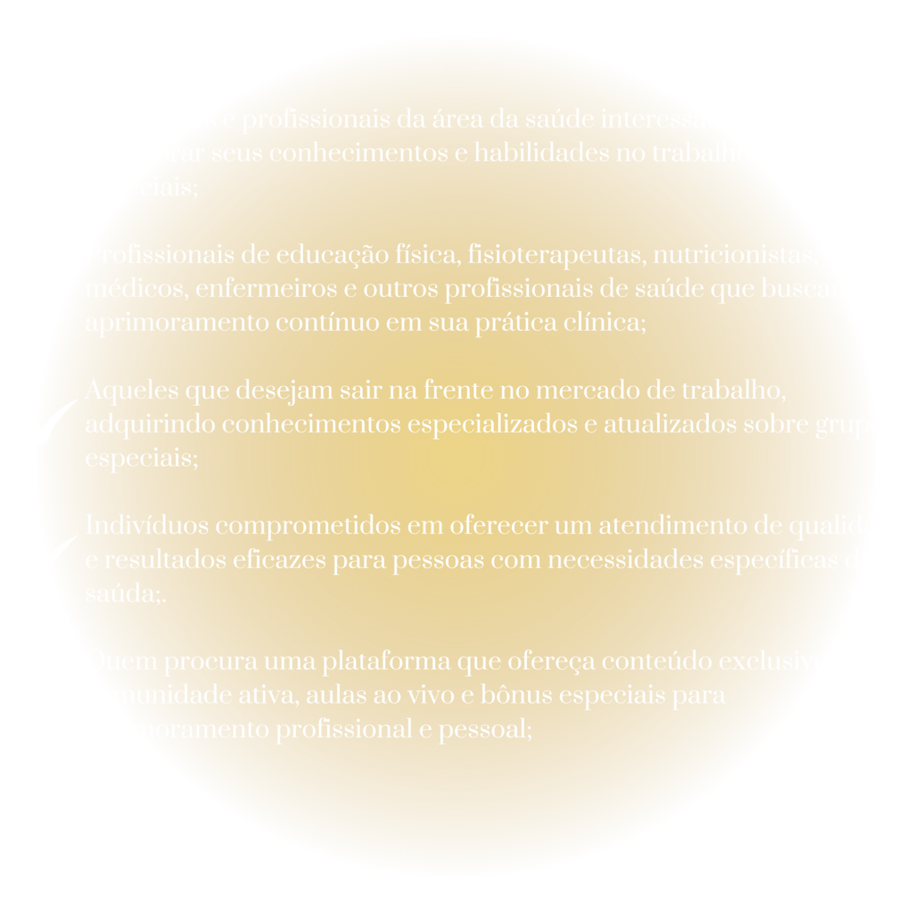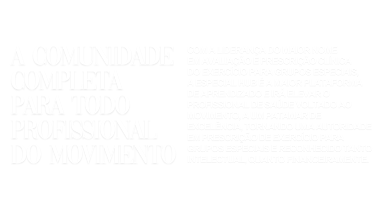 Aprenda e evolua com a maior plataforma de ensino dedicada à exercícios para grupos especiais. Seja parte de uma comunidade ativa e transformadora!